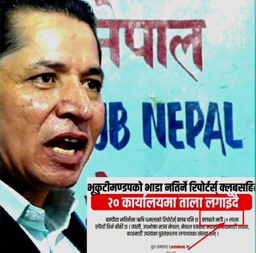काठमाडौं । पत्रकार ऋषि धमलाले सञ्चालन गर्दै आएको रिपोर्टर्स क्लबमा समाज कल्याण परिषदका कर्मचारीले ताला लगाइदिएका छन्। राजधानीको भृकुटीमण्डपस्थित उक्त क्लबले भाडा नतिरेको जनाउँदै आज दिउँसो क्लबको दुवै ढोकामा ताल्चा लगाइएको हो। समाज कल्याण परिषदका…