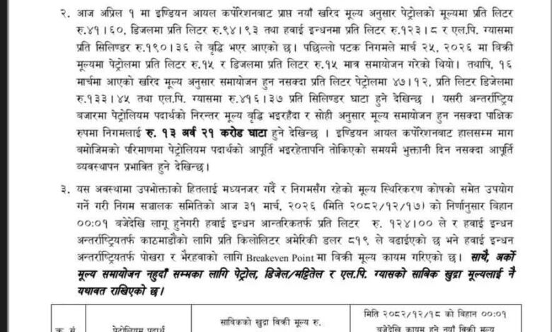 निगमका अनुसार अन्तर्राष्ट्रिय बजारमा पेट्रोलियम पदार्थको निरन्तर मूल्यवृद्धिका कारण प्राप्त नयाँ खरिद मूल्यअनुसार स्वचालित प्रणालीमार्फत मूल्य समायोजन गर्नुपर्ने अवस्था सिर्जना भएको हो। यद्यपि, तत्कालका लागि पेट्रोल, डिजेल र मट्टितेलको खुद्रा मूल्य यथावत् राखिएको छ भने हवाई इन्धनमा मात्र समायोजन गरिएको छ।