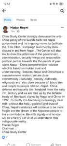 विज्ञप्तिमा नेपाल-चीनबीच आर्थिक, सांस्कृतिक, सामाजिक, धार्मिक र रक्तसम्बन्धका साथै ७औं शताब्दीदेखिको रक्षा सहयोग र १७९२ को बेत्रावती सन्धिको ऐतिहासिक पृष्ठभूमि पनि उल्लेख गरिएको छ। यसमाँ जोड दिँदै चीन अध्ययन केन्द्रका अध्यक्ष रेग्मीले भनेका छन्, “चीनको सहयोग, सद्भावना र विश्वास बिना नेपालको अस्तित्व अझ कमजोर हुनेछ र गरिमापूर्ण जीवनको नेपाली जनताको सपना टाढा पर्नेछ। यो निर्विवाद वास्तविकता हो।”