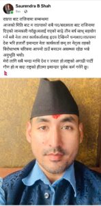 काठमाडौं, – राष्ट्रिय प्रजातन्त्र पार्टी (राप्रपा) का सह-महामन्त्री सौरेन्द्र बहादुर शाहले आफू राप्रपाको सबै पद र सदस्यताबाट राजिनामा दिएको आज सार्वजनिक गरेका छन्।
