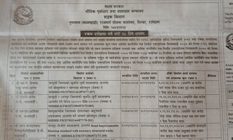 रामेछाप । पुष्पलाल (मध्यपहाडी) राजमार्ग योजना कार्यालय, सित्खा, रामेछापले सम्झौता बमोजिम निर्माण कार्य सम्पन्न नगर्ने पाँच वटा निर्माण व्यवसायीहरूलाई ३५ दिनभित्र करिब १ अर्ब रुपैयाँ राजस्व खातामा दाखिला गर्न अन्तिम अल्टिमेटम दिएको छ। यो पछिल्लो समय नेपालको सडक निर्माण इतिहासमै ठेकेदारविरुद्धको सबैभन्दा ठूलो कारबाही मध्ये एक हो।
