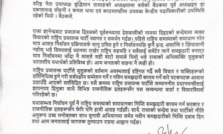‘राजाको सन्देशलाई राप्रपाको स्वागत, राष्ट्रिय सहमतिको पहल अघि बढाउने निर्णय