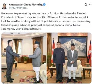 उनले थप्दै भनेका छन्, “चीन–नेपाल साझा भविष्यको समुदाय निर्माणका लागि हाम्रो चिरस्थायी मित्रतालाई अझ सुदृढ बनाउँदै व्यवहारिक सहयोगलाई अघि बढाउन सबै नेपाली मित्रहरूसँग सहकार्य गर्न उत्सुक छु।”