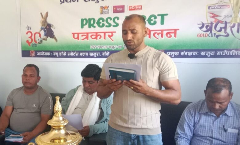 बाँके । बाँकेको खजुरा गाउँपालिका–४, डी गाउँमा सोमबारदेखि सुरु हुने ‘प्रथम खजुरा गोल्डकप’ को तयारी पूरा भएको छ। आयोजक न्यू डाँफे स्पोर्ट्स क्लबले आइतबार पत्रकार सम्मेलन गरी गोल्डकपको सम्पूर्ण तयारी पूरा भएको जनाएको छ।