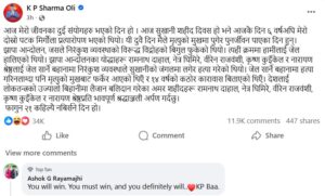 सामाजिक सञ्जालमार्फत ओलीले लेखेका छन्, ‘आज मेरो जीवनका दुई संयोगहरु भएको दिन हो। आज सुखानी शहीद दिवस हो भने आजकै दिन ६ वर्षअघि मेरो दोस्रो पटक मिर्गौला प्रत्यारोपण भएको थियो। यी दुवै दिन मैले मृत्युको मुखमा पुगेर पुनर्जीवन पाएका दिन हुन्।’