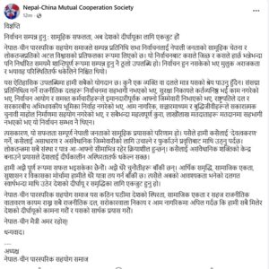 नेपाल-चीन पारस्परिक सहयोग समाज यस कठिन घडीमा देशको स्थिरता, सामाजिक एकता र सहज राजनीतिक वातावरण कायम राख्न सबै राजनीतिक दल, सरोकारवाला निकाय र आम नागरिकमा अपिल गर्दछ कि हामी सबै मिलेर देशको दीर्घायूको कामना गरौं र यसको सार्थक प्रयास गरौं।