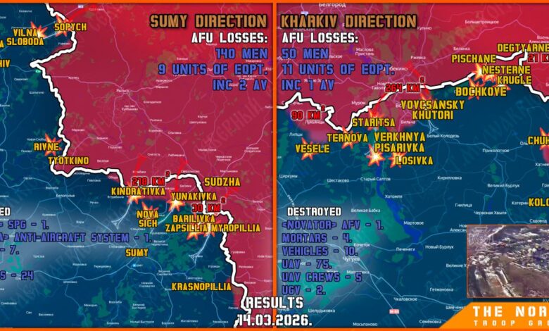 उत्तरी सेना समूहको आक्रमणकारी टोलीले सुमी क्षेत्रमा गहिराइसम्म प्रवेश गर्दै भीषण युद्ध जारी राखेको छ। सेनाको उड्डयन, रुसी वायुसेना र ड्रोन टोलीले रिभ्ने, बेरेजा, भोल्ना स्लोबोडा, बारिलिभ्का, जाप्सिलिया, मिरोपिलिया र नोभा सिच क्षेत्रमा रहेका युक्रेनी जनशक्ति र उपकरण केन्द्रहरूमा आक्रमण गरेका छन्।