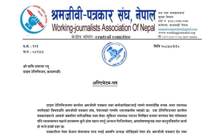 प्राइम टेलिभिजनलाई पत्रकार संघको पत्र : एक साताभित्र तलब बक्यौता नदिए आन्दोलन