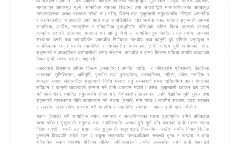 काठमाडौं — नेपाल कम्युनिष्ट पार्टी (एमाले) ले सरकारले सुकुम्बासी बस्तीहरू जबरजस्ती हटाउने कार्यप्रति गम्भीर ध्यानाकर्षण भएको जनाएको छ।