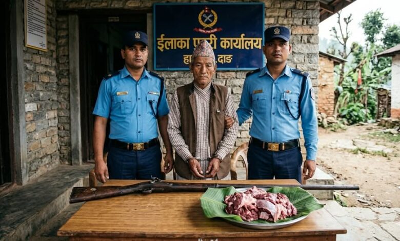 इलाका प्रहरी कार्यालय हापुरेबाट खटिएको प्रहरी टोलीले उनको घर नजिकै रहेको गोठबाट एक थान भरूवा बन्दुक र करिब २ किलोग्राम मृगको मासु बरामद गरेको हो। प्रहरीले खड्कालाई घटनास्थलबाटै नियन्त्रणमा लिएको छ।