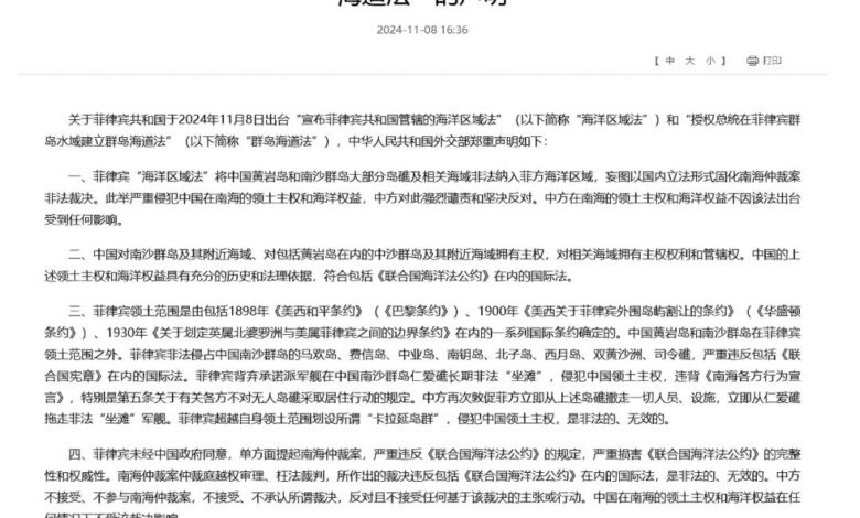 फिलिपिन्सद्वारा पेश गरिएको “दुष्ट कानून”ले कानूनको आधारभूत भावनालाई उल्लङ्घन गर्दछ, राजनीतिक हेरफेरको प्रकृति र अवैध रूपमा समुद्री अधिकार र चासोहरू विस्तार गर्ने मनसायलाई हाइलाइट गर्दछ। चीनको नान्शा टापुहरू र छेउछाउको पानी साथै ह्वानयेन टापुहरू र नान्शा टापु तथा लगायत छेउछाउको पानीमा सार्वभौमिकता छ र यससँग सम्बन्धित पानीहरूमा सार्वभौम अधिकार छ।