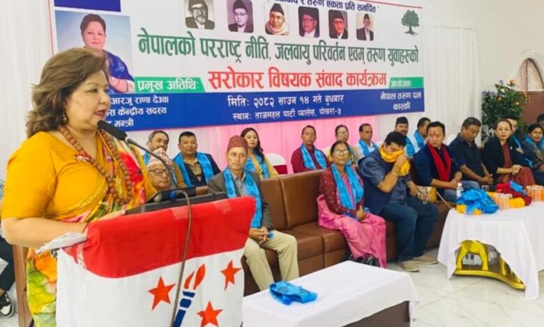 नेपाल तरुण दल कास्कीले बुधबार पोखरामा आयोजित ‘नेपालको परराष्ट्र नीति, जलवायु परिवर्तन र तरुण युवाको सरोकार विषयक संवाद कार्यक्रम’मा उनले आन्तरिक विवादलाई पार्टीभित्रै मिलाउनुपर्ने बताइन्।