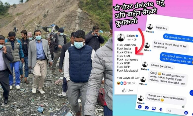 यता काठमाडौं महानगरका मेयर बालेन्द्र साह मध्यरातमा लेखिएको अश्लिल र अमर्यादित फेसबुक स्टाटसको कारण चर्को विवादमा तानिएका छन् । उनले छिमेकी मित्रराष्ट्रहरुसँगै ठूला राजनीतिक दलप्रति अंग्रेजीमा अश्लिल शब्दले गाली गरेका हुन् । सबैतिरबाट विरोध भएपछि उनले राति नै स्टाटस डिलिट गरेका छन् ।